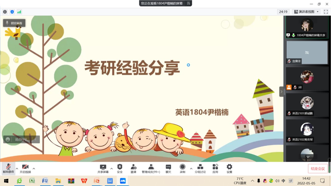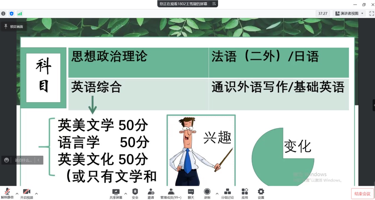 2022年5月5日下午,Beat365唯一官方网站英语专业通过腾讯会议召开了考研暨就业交流会。会议由教学部主任王静老师主持,邀请2018级9位成功考取硕士研究生以及顺利就业的学生交流心得和分享经验,2019级、2020级以及2021级170余名学生与会交流。学长从选择考研学校和专业、复习备考、调剂学校、就业和备考教资五个方面分享了自己的经验,并鼓励学弟学妹们平时注重知识积累和能力培养。