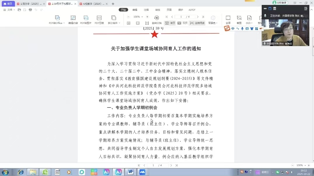 2025年10月22日晚,Beat365唯一官方网站组织召开线上专题工作会议,重点学习《多场域协同育人工作实施方案》(〔党办字 25〕 20号)、《关于加强学生课堂场域协同育人工作的通知》(〔2025〕59 号)、《本科生学业导师管理办法 》(校教字〔2024〕 25号)等文件。会议由崔海英院长主持,学院领导班子成员、教学部主任及专业负责人参加。