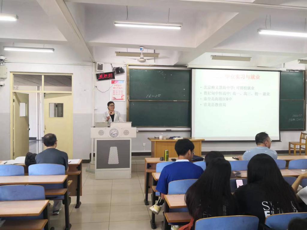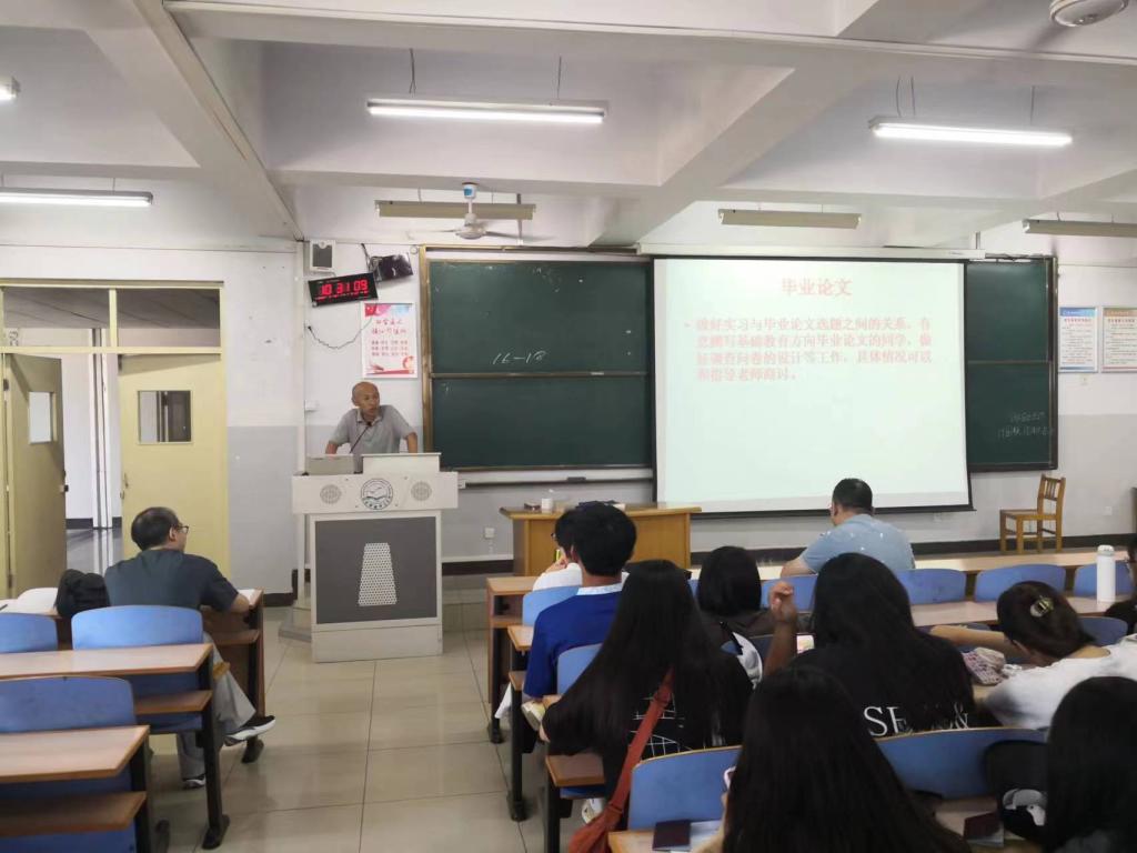 王静老师介绍了下学期教育实习的大致安排,明确了教育实习的教学目标。罗学锋副院长详细介绍了实习基地的设置、实习的具体要求、实习与毕业论文、实习与就业的关系等。邵丽君书记主要强调了实习期间的安全问题。赵庚主任结合实习给大家普及了目前的就业形势,要求大家在完成实习任务的同时,做好职业生涯的规划。
