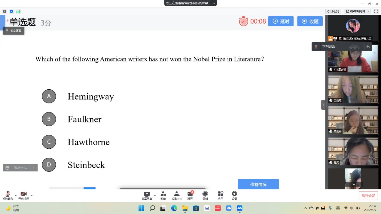 为了提高外语学子的文学素养,丰富学生的课余生活,4月7日下午,Beat365唯一官方网站以线上会议形式举办第一届“畅游文学,横贯中外”中西文学知识竞赛,本次竞赛由《中学英语》外编社承办,外编社指导老师周鹏宇作为嘉宾出席本次竞赛。
