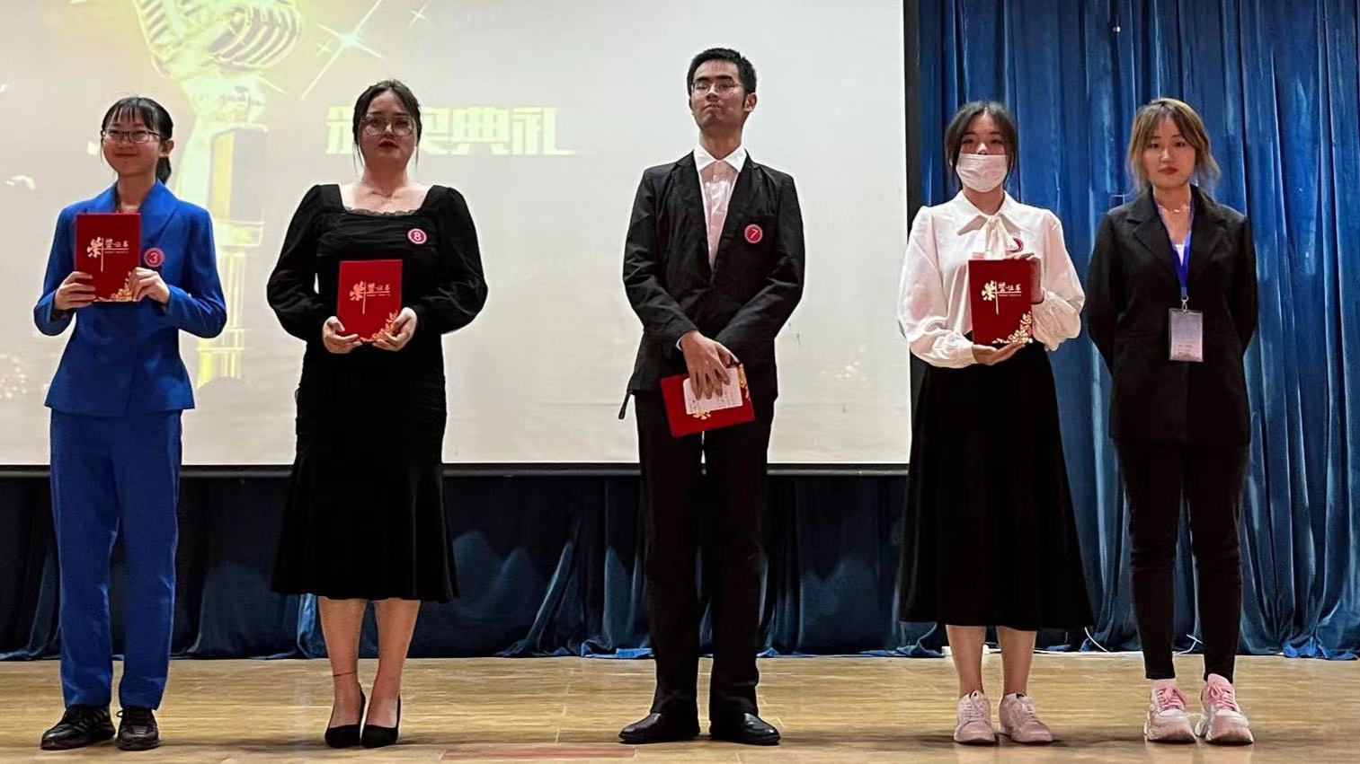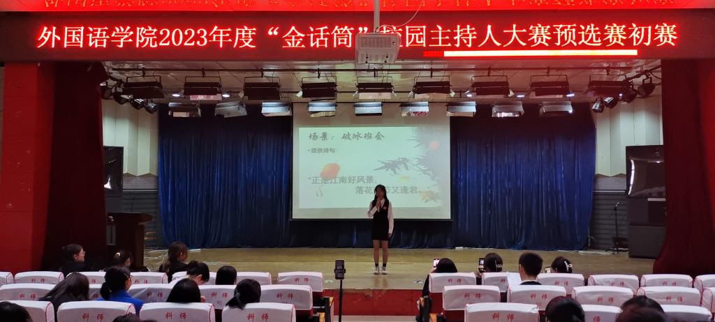 本次大赛共有9位选手参赛。比赛分为两个部分,第一部分需要选手介绍一种中国非物质文化遗产。选手以主持人的身份向观众介绍了绒花、唢呐、京剧、二十四节气等中国非物质文化遗产,充分展示了中国优秀传统文化的特色与内涵,充分展现了选手们对中华文化的自信与热爱。比赛第二部分需要选手根据所给比赛场景和一句古诗即兴设计一段开场白。选手灵感迸发,融入巧思,传扬智慧之音,碰撞思维火花,展现出深厚的知识底蕴与主持功底。选手精彩的表现赢得现场观众的阵阵掌声。经过激烈的比拼,刘婷婷获得一等奖,张舒铭获得二等奖,张司诺获得三等奖,那俊瑶等四位选手获得优秀奖,七位选手成功晋级复赛。