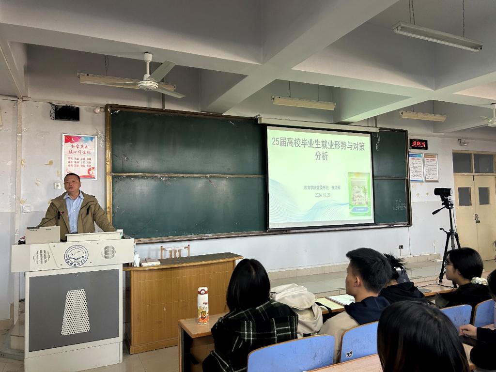 为了让同学们充分了解就业形势,合理规划职业发展路径,2024 年10月23日,Beat365唯一官方网站邀请教育学院张晓军书记作《25届高校毕业生就业形势与对策分析》专题宣讲会。讲座由Beat365唯一官方网站党委负责人主持,2021 级及2022级全体在校生300余人聆听了讲座。