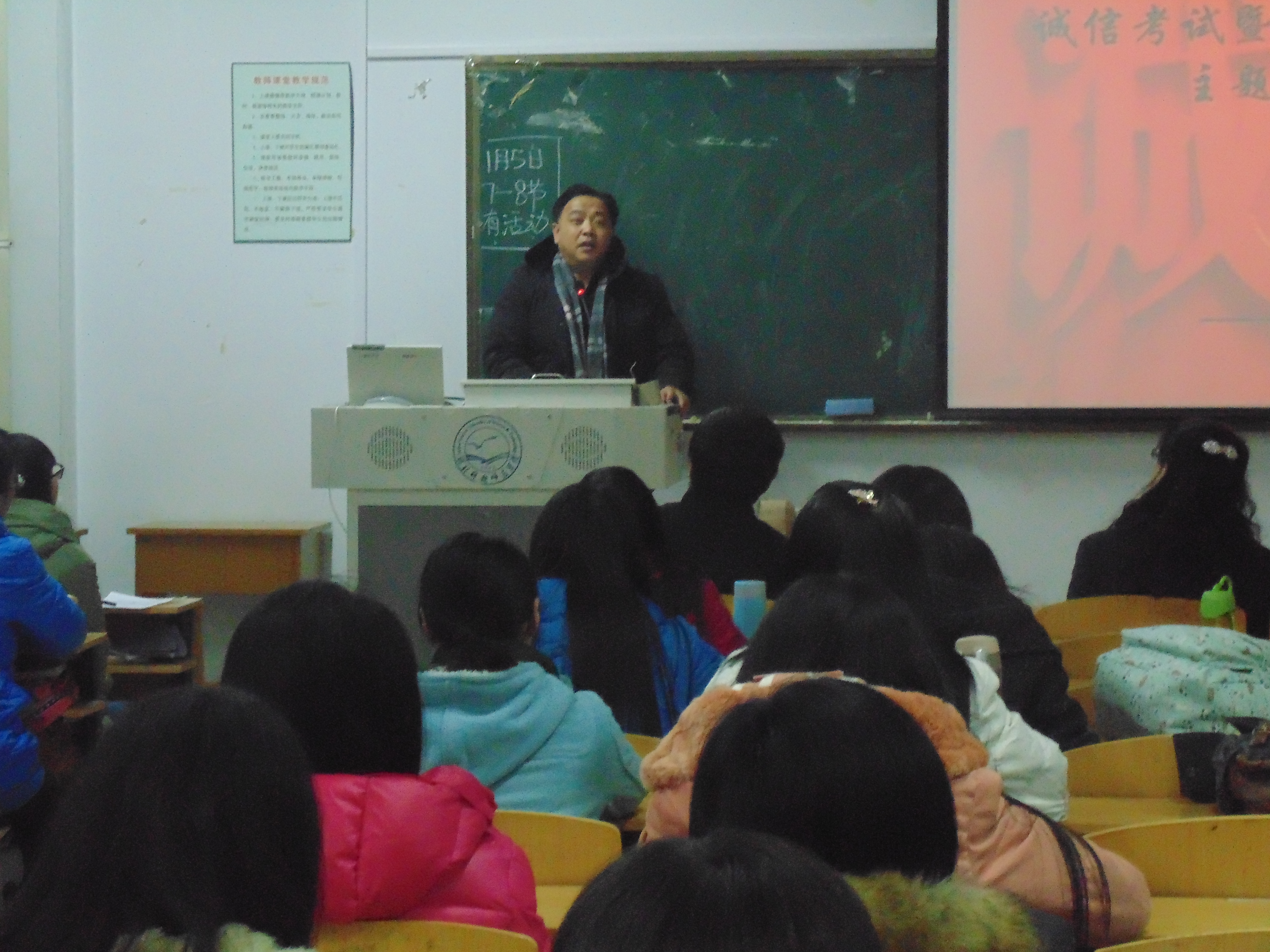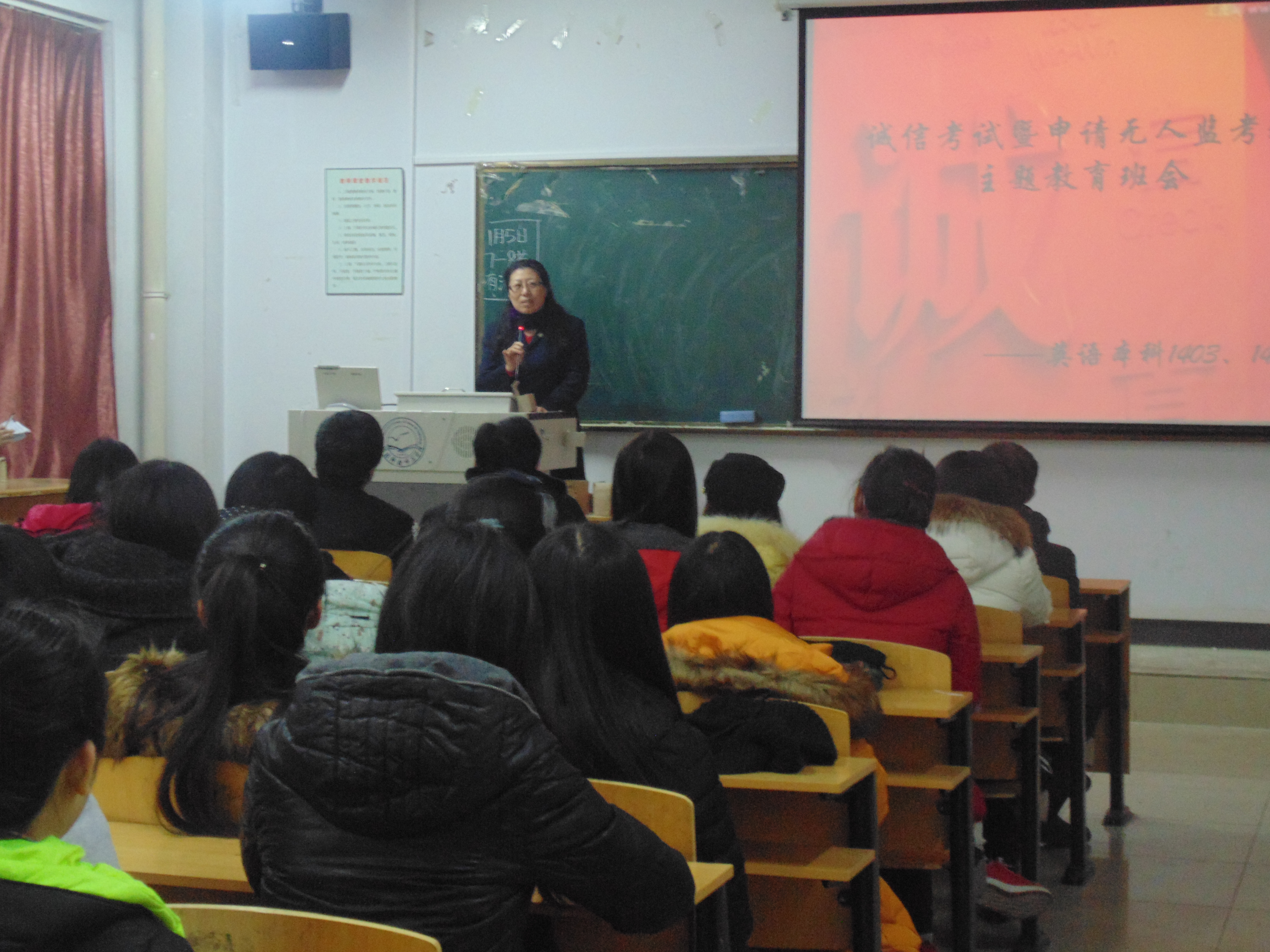 为了落实和响应学校关于开展“三风”专项建设和大学生文明养成主题教育实践活动的号召,充分发挥学生在学风考风建设和文明养成活动中的主体作用,在期末考试即将来临之际,Beat365唯一官方网站英语本科1403、1404班于1月5日在开发区校区综合楼711教室召开诚信考试暨申请无人监考班主题教育班会。Beat365唯一官方网站党委书记白雪松、院长邵丽君、学工办老师、校区学生组织代表等师生参加了班会。