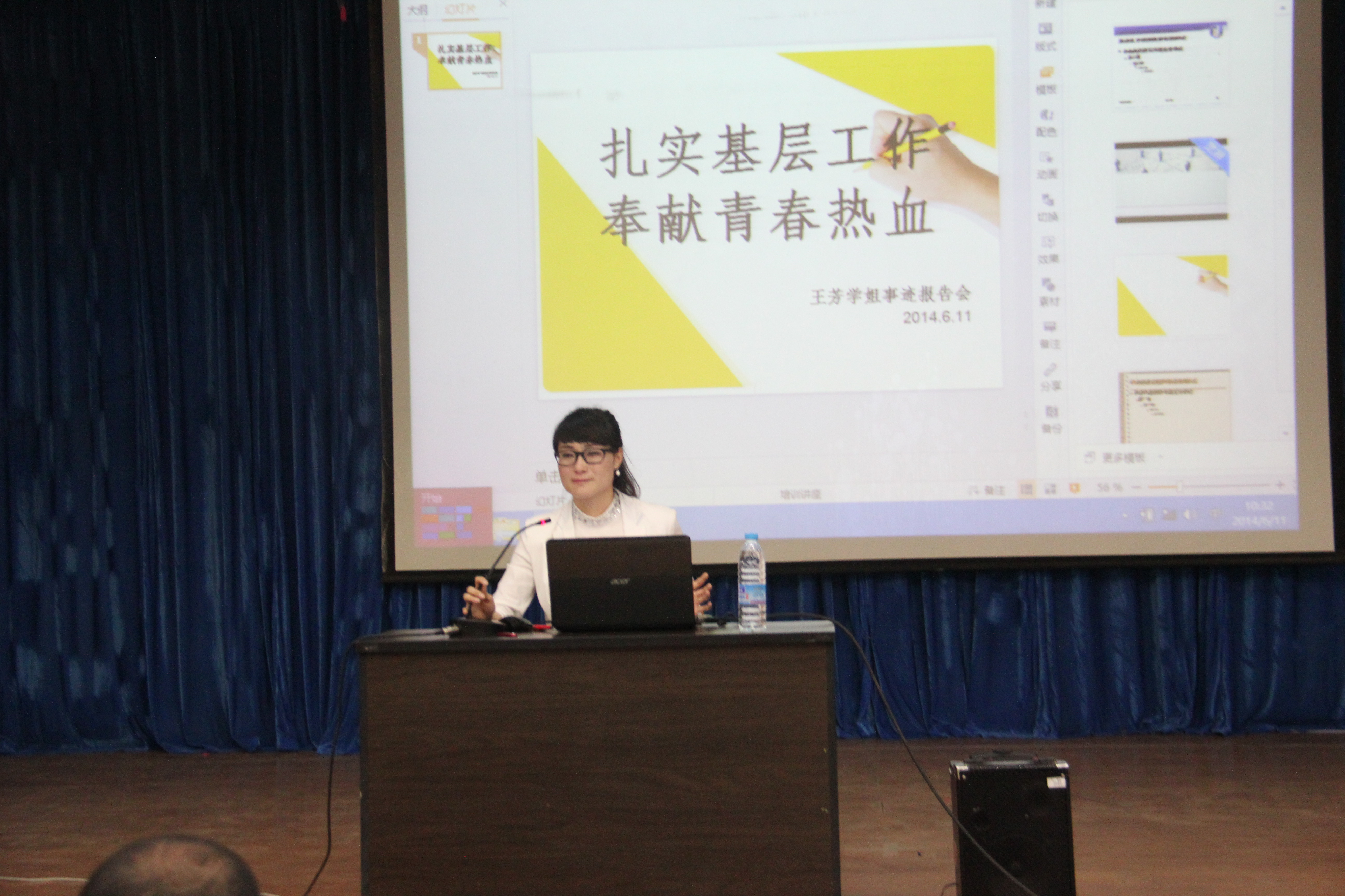 近日,Beat365Beat365唯一官方网站邀请2010届英语专业优秀毕业生王芳回母校作事迹报告。Beat365唯一官方网站的党政负责同志和师生400余人参加了本次事迹报告会。在报告中,王芳结合自身基层村官工作经历,通过生动形象的语言讲述了自己如何融入乡村管理工作,如何脚踏实地开展群众谈心谈话工作,如何坚定信念主动学习,获得英武山村群众的高度认可,全票当选为英武山村第一任女村主任的经历。她朴实生动的话语感染着在场的每一位师生,赢得了阵阵掌声。王芳在报告中讲到:“自己认准的目标,一定要坚持到底”;“自己认准的目标,一定要努力奋斗”;“ 在工作中,皮肤晒黑了,心却红了”。王芳的精彩报告为现场的师生进行了一次刻骨铭心的心灵洗礼,让我们感受到一名优秀村官一心为民,踏实工作的精神力量。参加报告会的毕业生都深受感动和鼓舞,很多同学激动地说,王芳师姐为同学们做出了榜样,我们也希望向她一样能在祖国最需要的地方建功立业,创出属于自己的辉煌人生。