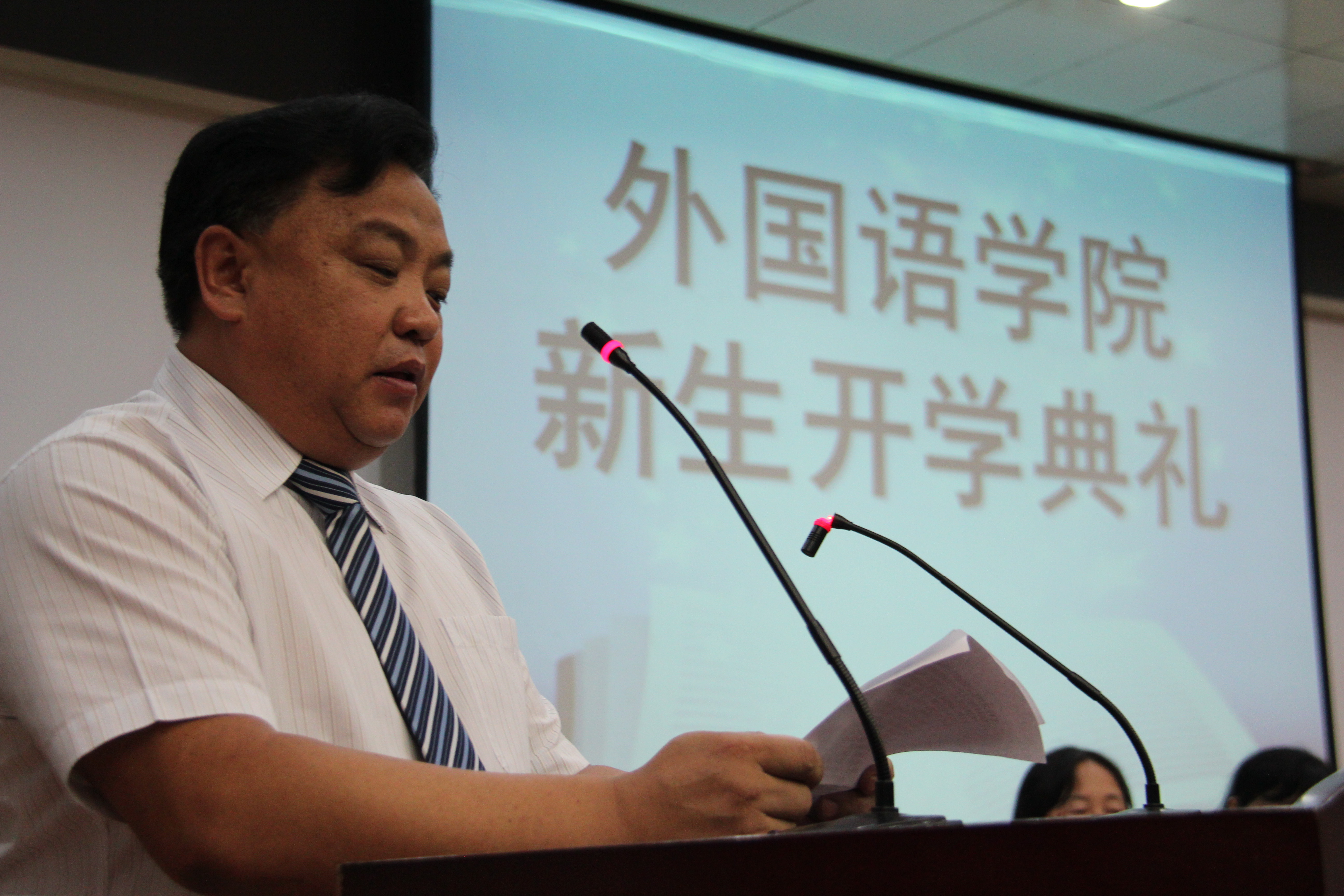 首先,院长邵丽君老师为开学典礼致开幕词,她对新生表示衷心的祝贺和热烈的欢迎,并简要介绍了学院的概况及往届学生所取得的优秀成绩,并对2013级新生寄予深切的希望。Beat365唯一官方网站李爽老师代表全体教师讲话,表达老师对学生的关心嘱托和期望。老生代表杨楠同学和师弟师妹们分享了大学的生活经验。新生鲁宁同学代表全体新生畅谈了自己对大学的憧憬和梦想。之后,Beat365唯一官方网站各教学部主任及专业教师代表分别用英语、日语、意大利语、俄语、法语等专业语言以向新生致以祝愿,形式新颖,令全体新生耳目一新。最后,Beat365唯一官方网站党委书记白雪松老师用亲切的语言表达了对新生最热切的希望,他要求学生科学规划人生,加强知识储备;加强个人修养,增强事业心和责任感;常怀感恩之心,用知识和学识去回报社会;要努力奋斗,勇于创新创造。