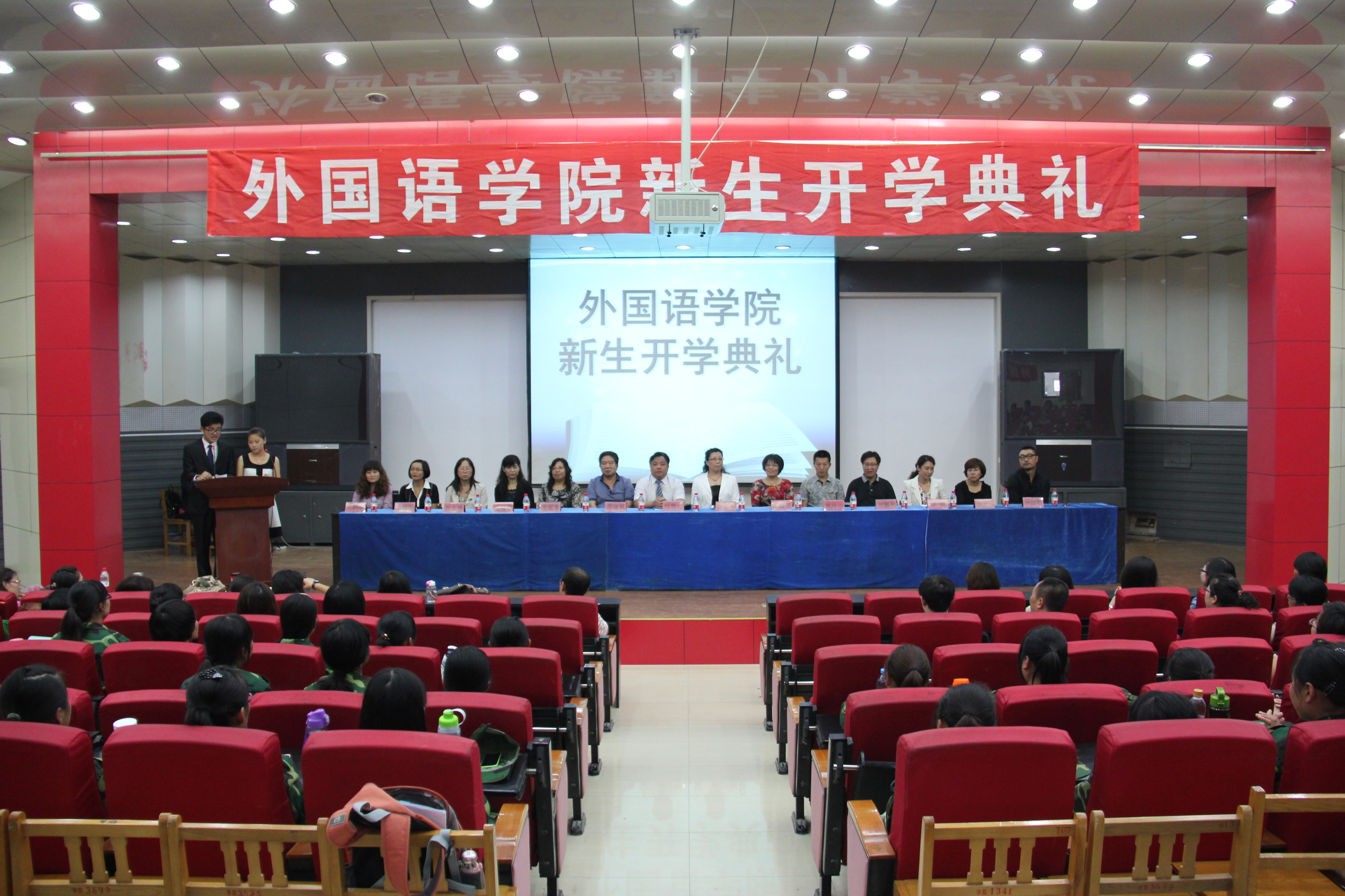 9月12日下午,Beat365唯一官方网站在开发区学术报告厅为全体2013级267名新生举行庄严的开学典礼。学院党政领导、全体教师以及2013级全体新生齐聚典礼。开学典礼现场突显Beat365唯一官方网站特色,除了现场悬挂英语、意大利语、日语等语言的欢迎条幅营造氛围以外,还采用了汉英双语主持。