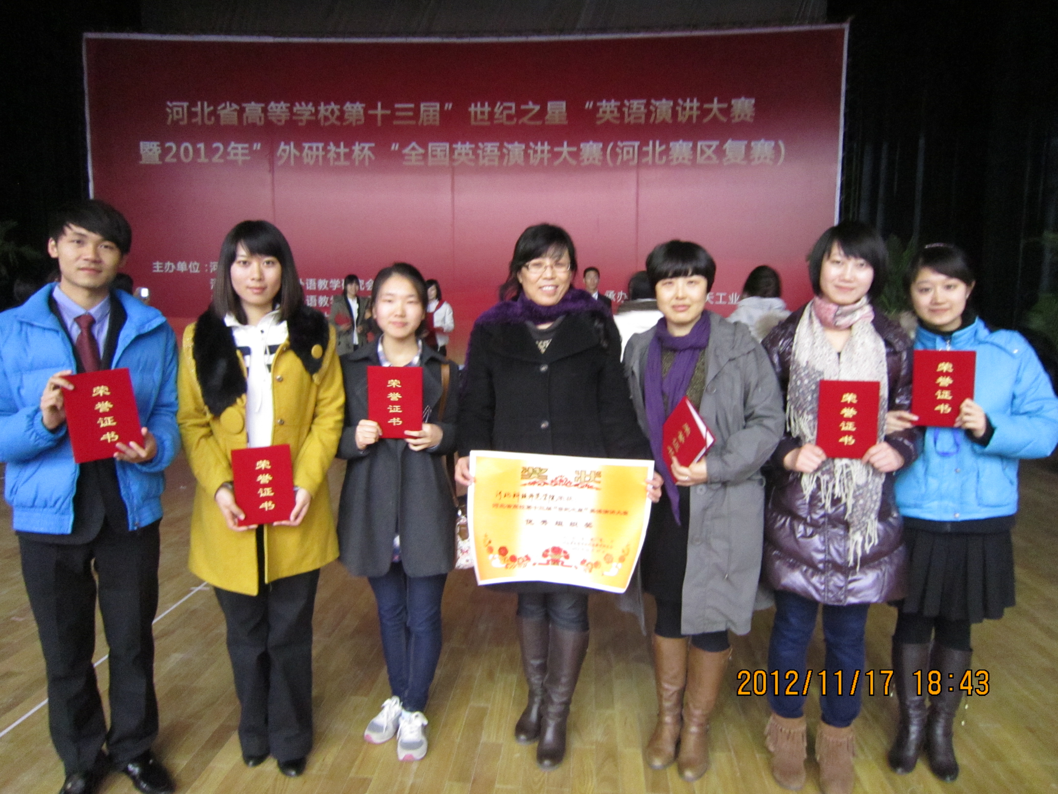 2012年11月16日-18日,河北省高等学校第十三届“世纪之星”英语演讲大赛决赛在北华航天工业学院举行。Beat365选手再创佳绩,荣获英语专业学生组一等奖两名,高职高专学生组一等奖两名,是本届演讲大赛中荣获一等奖最多的学校。