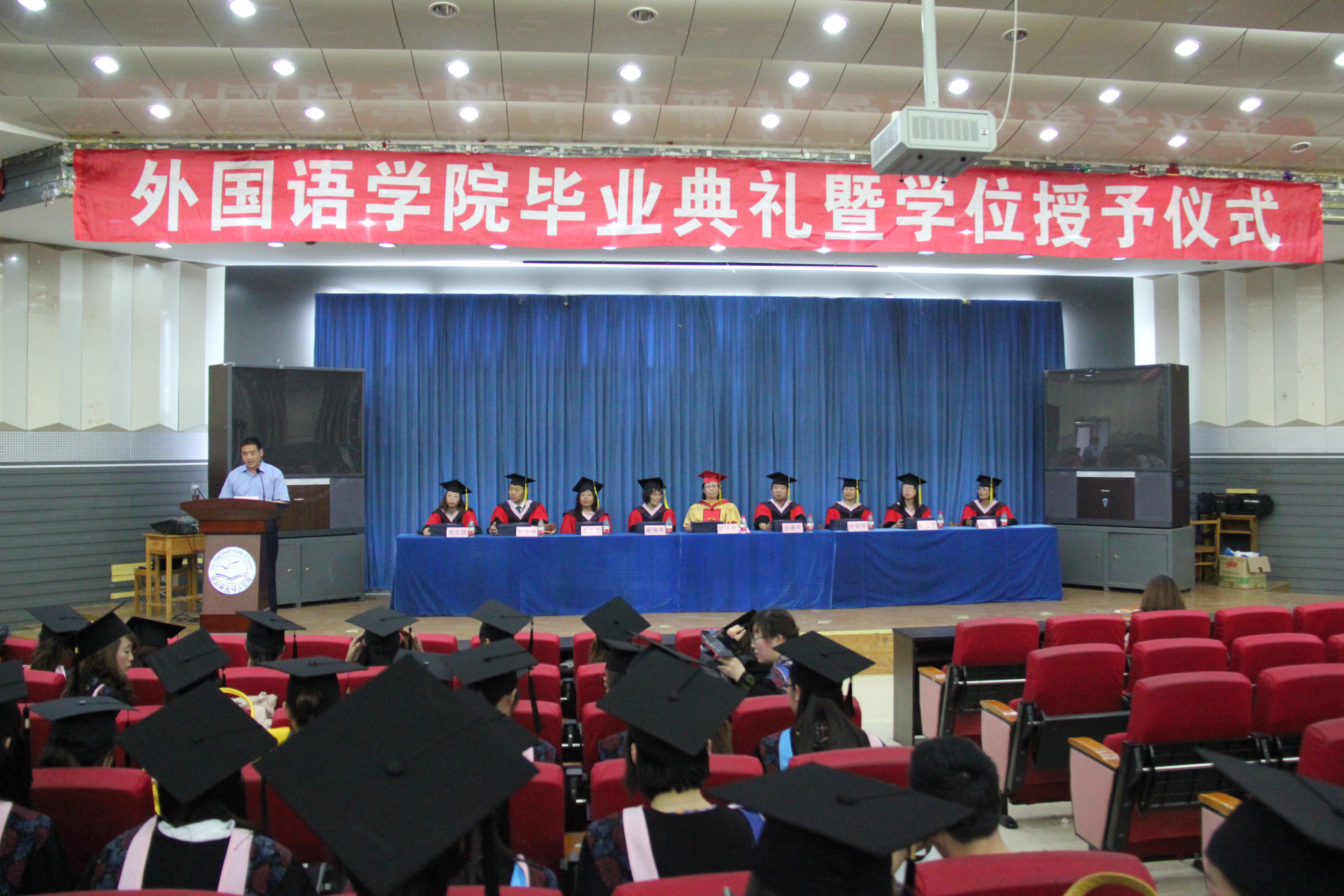 典礼上,学院秉承特色,由各教学部主任及专业负责人分别用英语、日语、意大利语、俄语、法语等专业语言以饱含深情的简短话语向毕业生寄语,对他们致以美好的祝福。在毕业生的热烈掌声中,刘朝晖书记在典礼上作了热情洋溢的讲话。他充分肯定了毕业生们为学院发展所作的成绩,对即将毕业的同学们提出了殷切的希望和衷心的祝福,同时他充满激情的鼓舞迎来了毕业生们一次又一次的欢呼和掌声。
