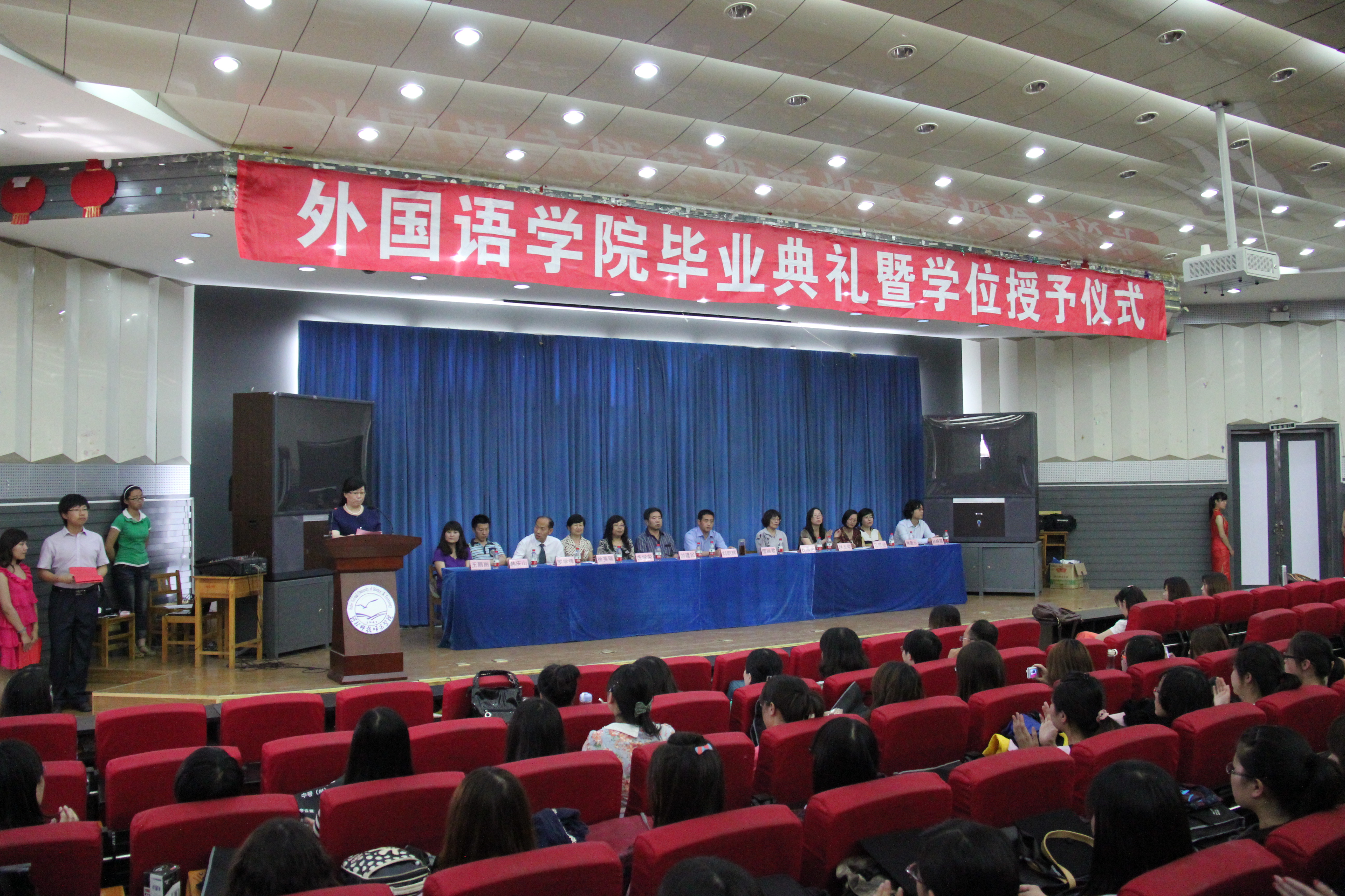 典礼上,邵丽君院长介绍了2012届毕业生的基本情况,对本届毕业生中考取研究生、公务员、参加西部计划以及专接本上线情况进行了简单介绍,并对大家顺利毕业表示了衷心的祝贺。2008级英语本科专业学生徐苗苗同学和2010级旅游英语专业彭建飞同学分别代表全体毕业生和在校生发言;英语本科教学部徐英瑞教授代表全院教师发言,鼓励大家学无止境,要终生学习、终生提高,方可成就终生,并指出学校永远是大家坚强的后盾。