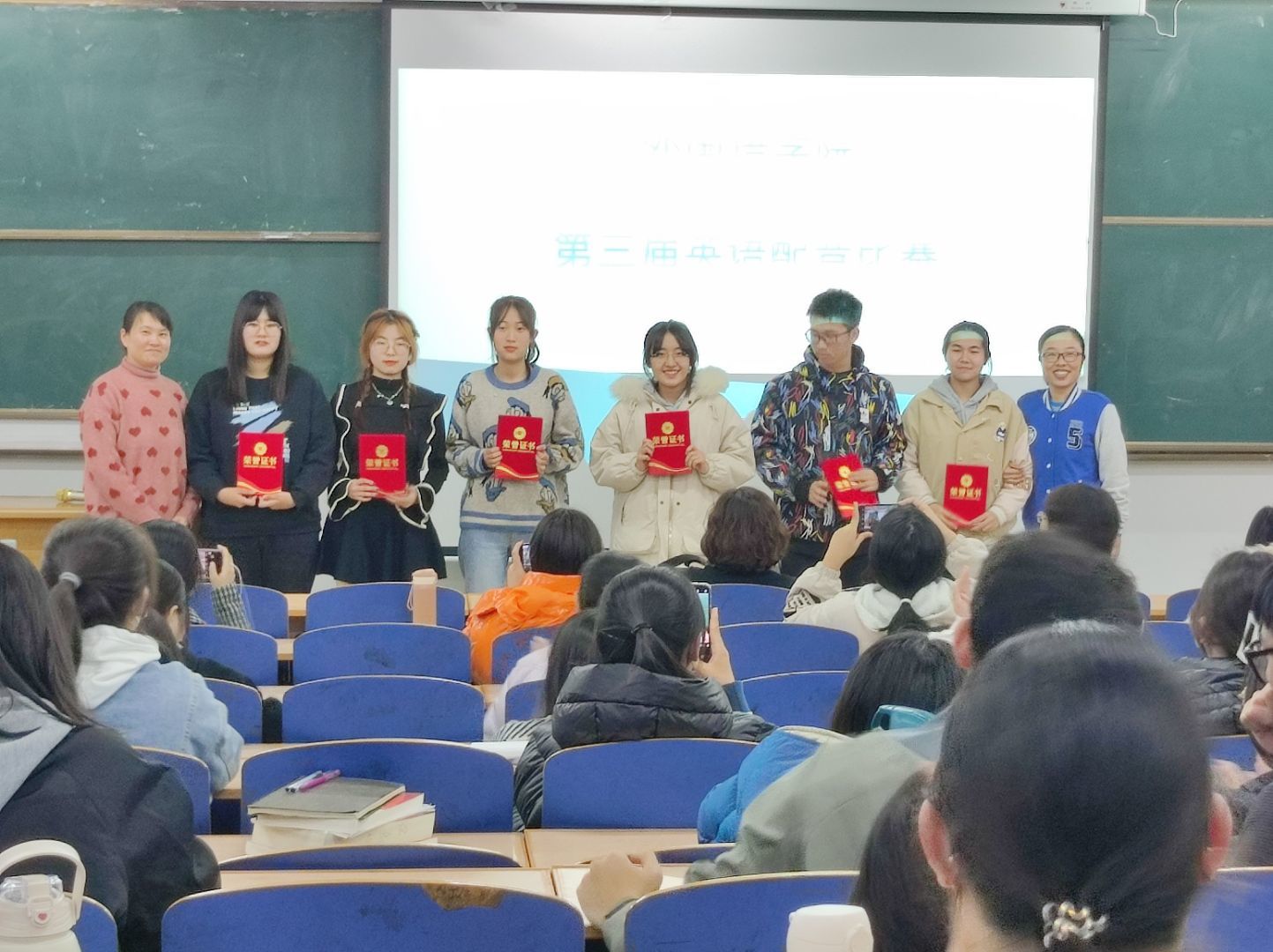 比赛开始前,学生会工作人员布置场地,进行多媒体设备的调试,并引导各位评委老师、比赛选手和观众有序入场。比赛开始后,主持人宣布比赛规则及流程,参赛选手有序上台进行比赛,配音展示后由评委老师对小组表现进行打分,工作人员核算得分。经过近两个小时的角逐,最终产生一等奖两组、二等奖四组、三等奖六组:《爱丽丝梦游仙境》组、《疯狂动物城》组荣获一等奖;《寻梦环游记》《功夫熊猫》等组荣获二等奖;《疯狂动物城》《飞屋环游记》《灰姑娘》等组荣获三等奖。赛后评委为获奖小组颁发荣誉证书。崔海英院长对同学们精彩的表现表示由衷地赞赏,并从规范发音、投入演绎、团队合作等方面对大家的表现给出中肯地点评,学生们收获颇丰。