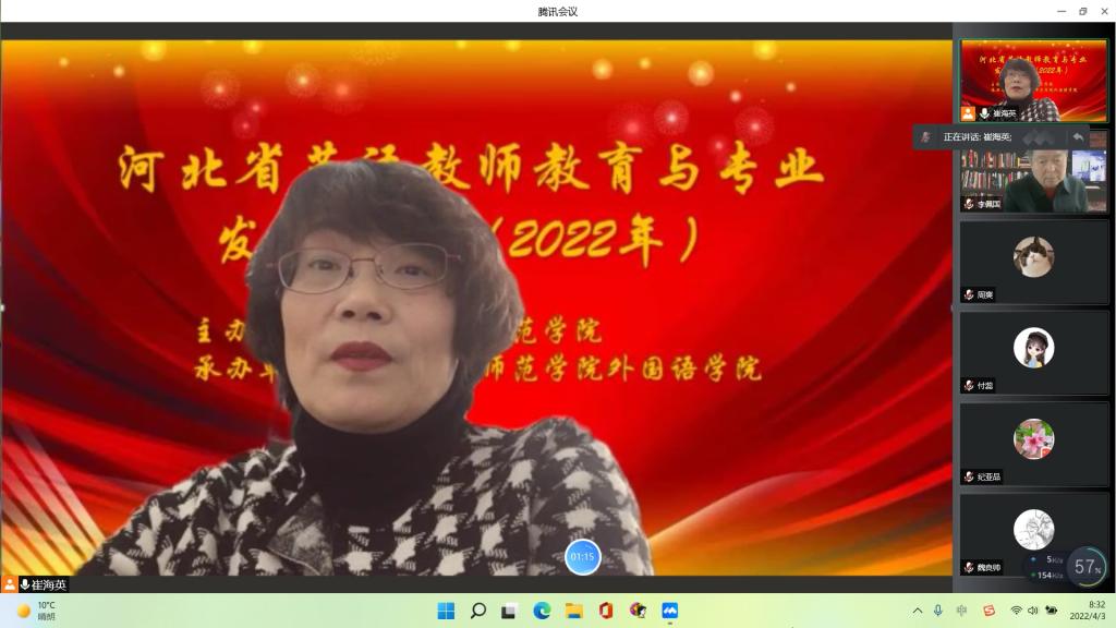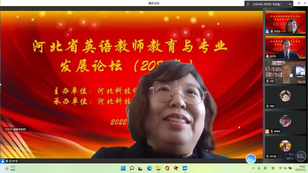 4月3日,由河北科技师范学院主办,河北科技师范学院Beat365唯一官方网站承办的2022年河北省英语教师教育与专业发展论坛以腾讯会议形式线上召开,由Beat365唯一官方网站崔海英院长和范学荣副院长主持,特邀全国著名师范院校的五名专家、一位基础教育学校校长共同探讨河北省英语教师教育与专业发展的议题。学校党委副书记李佩国教授致开幕辞。