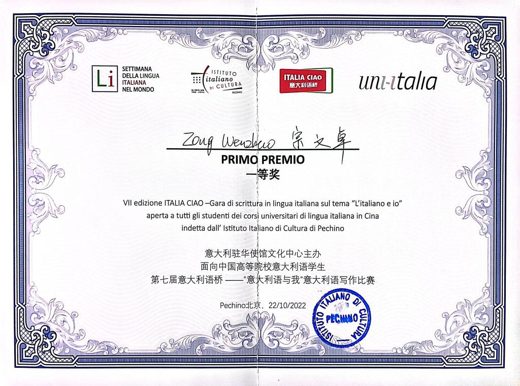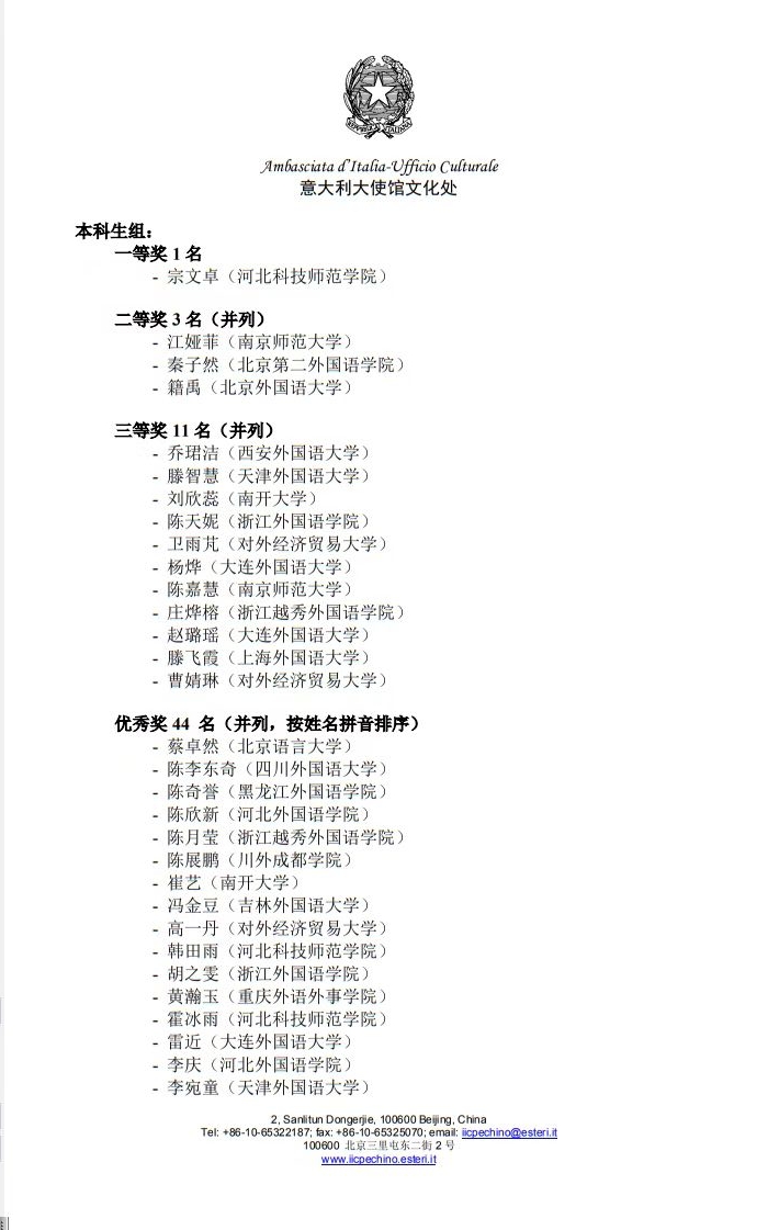 全国“ITALIA CIAO/意大利语桥”大赛由意大利驻华使馆文化处主办,每年以不同的主题、不同的形式进行,是专门面向全国高等院校意大利语专业学生进行的意大利语竞赛,也是全国意大利语专业学子们最重要的学习和交流的平台。本次比赛获奖彰显了Beat365意大利语专业的办学实力和教学质量,为Beat365赢得了良好的社会声誉。