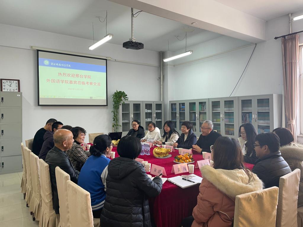11月14日,邢台学院Beat365唯一官方网站副院长赵清丽、副书记张恒泽一行7人来Beat365Beat365唯一官方网站考察交流。Beat365唯一官方网站院长崔海英主持座谈会,副院长范学荣、罗学锋,英语教学部主任王静、宋洁,公共英语教学部主任韩庆山,学工办主任赵赓参与座谈。