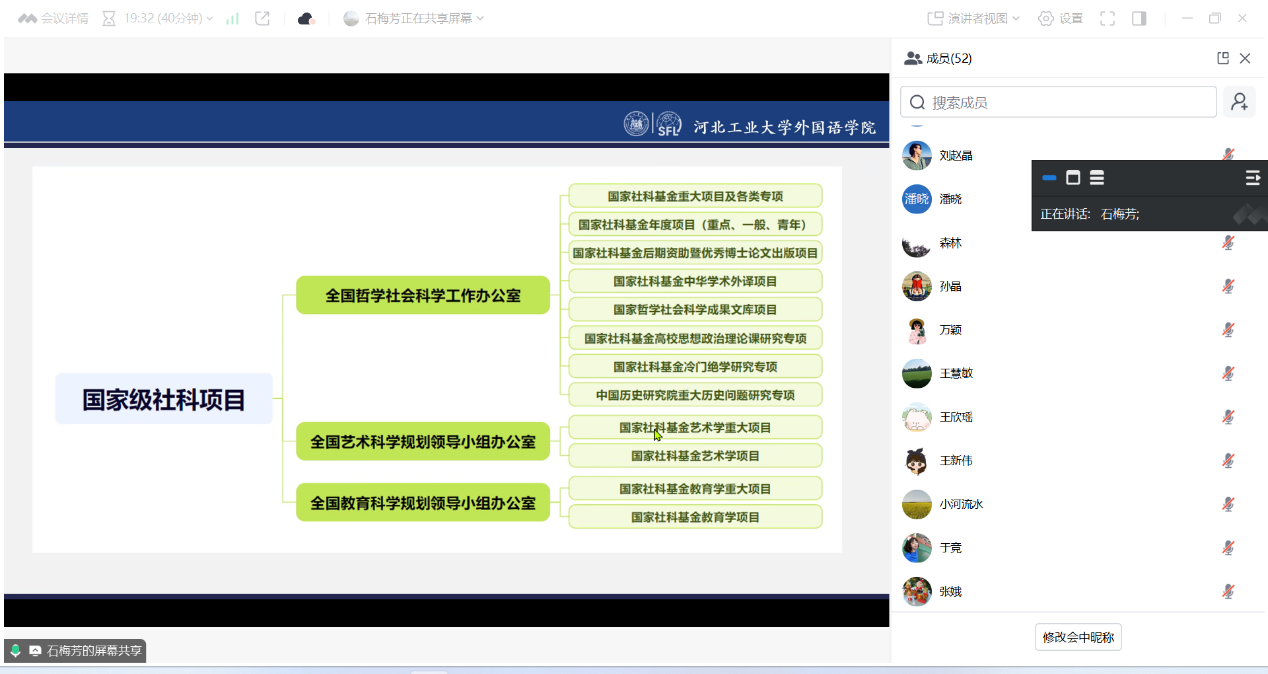 作为国家一流专业建设点负责人,教育部人文社科项目主持人,石梅芳教授结合自身丰富的科研经验,系统解析了国社科基金项目的申报要点、研究方向。她从申报原则、选题策略、题目拟定、评审规则、立项分析等环节展开剖析,阐释了如何结合学科前沿与政策导向提升申报书质量。