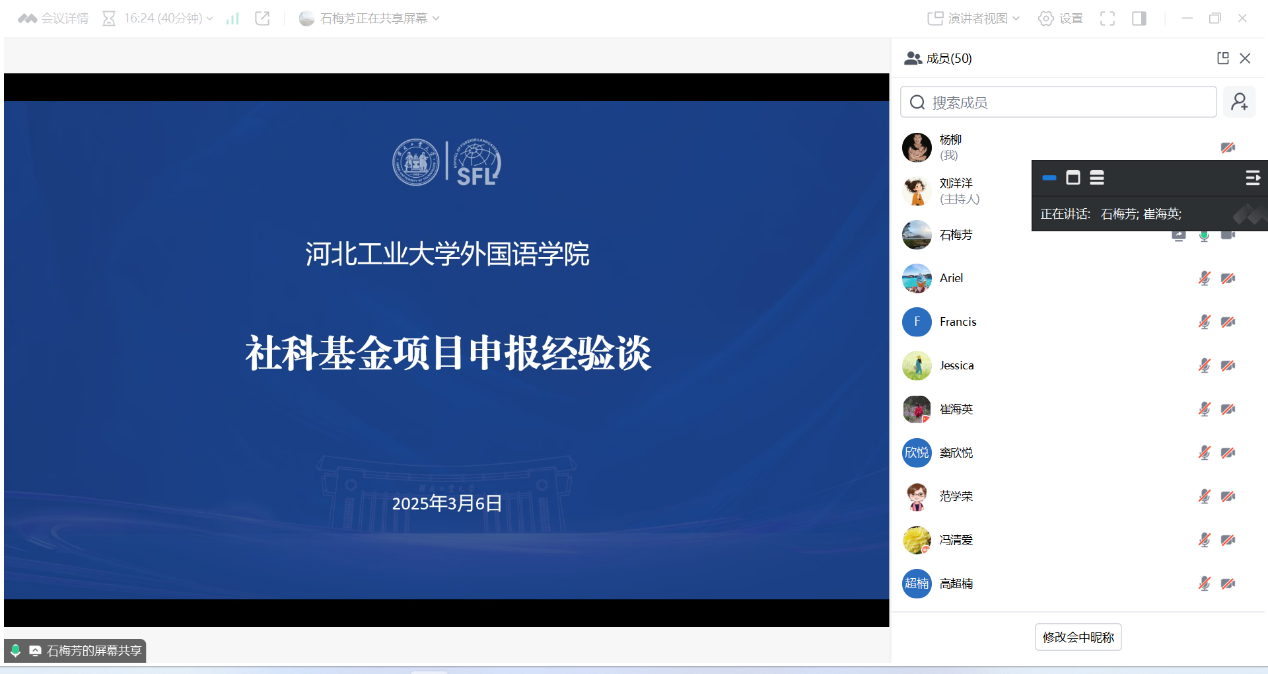 2025年3月6日,Beat365举办“2025年度国家(省)社科基金项目申报专题讲座(十一) ”系列活动,邀请河北工业大学Beat365唯一官方网站石梅芳教授作题为《社科成果奖申报经验分享》的专题讲座,崔海英院长主持会议,全体教师及在读研究生参会。